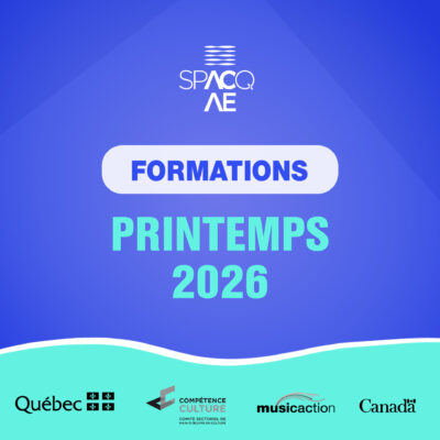La SPACQ-AE est ravie de vous dévoiler aujourd’hui sa programmation de formations pour le printemps 2026. Destinées aux créateurs et créatrices de tous horizons, ces formations combinent créativité, productivité, gestion de carrière et innovation technologique, reflétant la mission de l’organisme : soutenir le développement professionnel des auteurs, compositeurs et des artistes entrepreneurs.